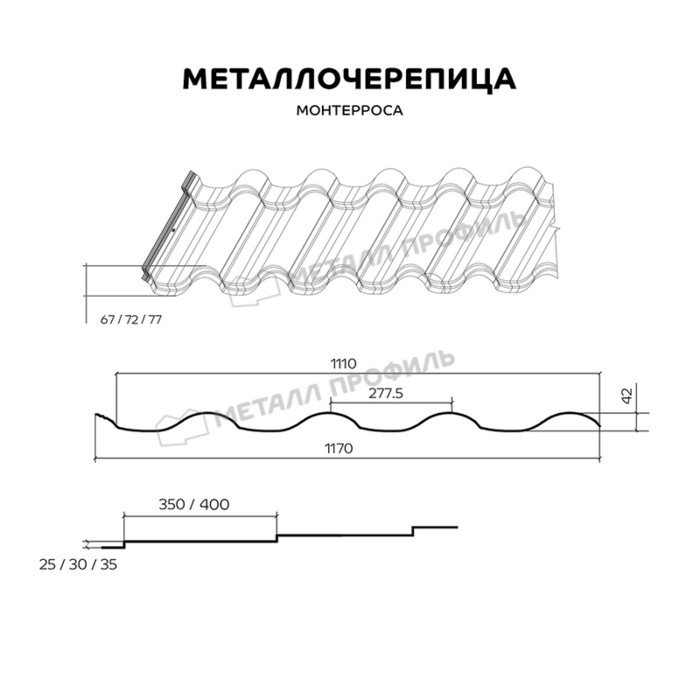 МОНТЕРРОСА — это оригинальный высокий профиль металлочерепицы. Вас порадует большой ассортимент глубины профиля, вы можете выбрать приглянувшийся из предложенных вариантов. С металлочерепицей МОНТЕРРОСА кровля будет похожа на классическую (глиняную). Этот профиль обеспечит необычный внешний вид крыше вашего дома. Мы предлагаем разные варианты высоты (25, 30 и 35 мм) и длины (350 и 400 мм) ступеней; полагаем, вы найдёте оптимальное сочетание. Подарите вашей крыше эстетику элегантных объёмных линий классического профиля!