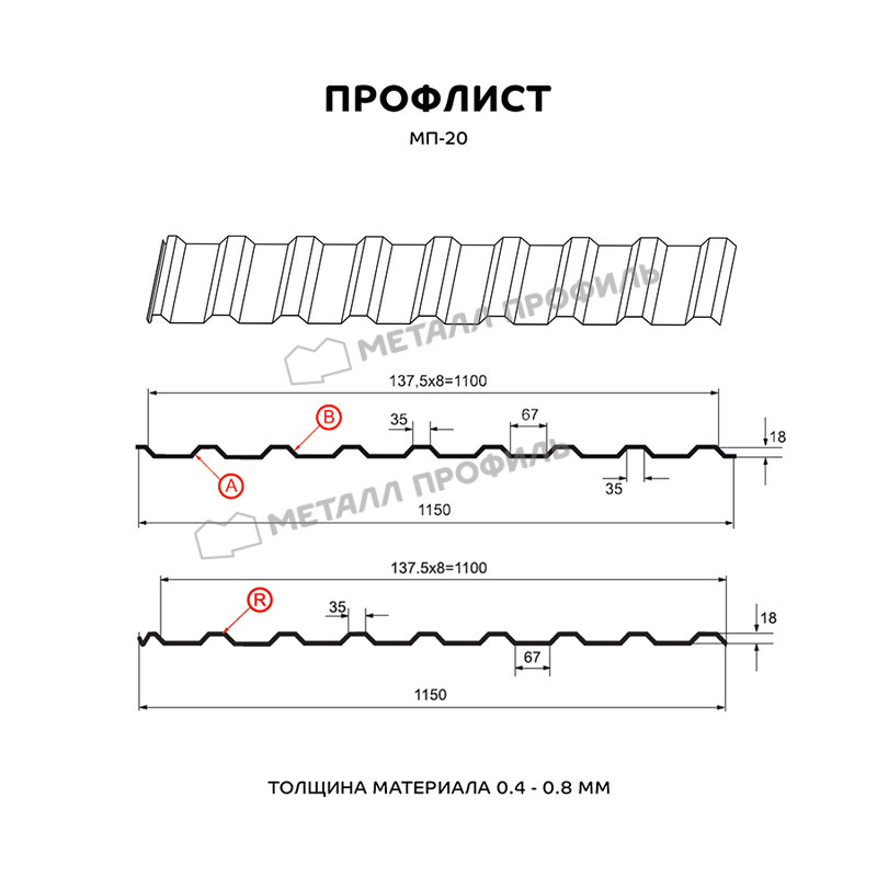 Профлист МП-20 является поистине многофункциональным стройматериалом. В сравнении с другими модификациями профлиста, этот производится в трёх версиях: А, В и R. Типы А и В используются для кровельных работ, возведения заборов, облицовки стен, для внутренней обшивки промышленных зданий, гаражей, ангаров и т.п. Вариант с буквой R отличается наличием специального желобка для отвода конденсата и предназначен в качестве кровельного покрытия. В зависимости от сферы применения, данный профлист выпускается из оцинкованной стали толщиной от 0,4 до 0,8 мм. Обратите внимание: несмотря на цифру 20 в названии, на самом деле глубина этого профиля – 18 мм. Это материал эконом-класса и имеет доступную стоимость. МП-20 – надёжный и качественный стройматериал, характеристики которого высоко ценят не только частные лица, но и крупные застройщики. Он обладает приличной жёсткостью, переносит значительные статические нагрузки и эффективно противостоит нагрузкам динамическим.